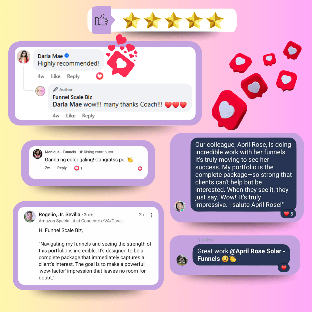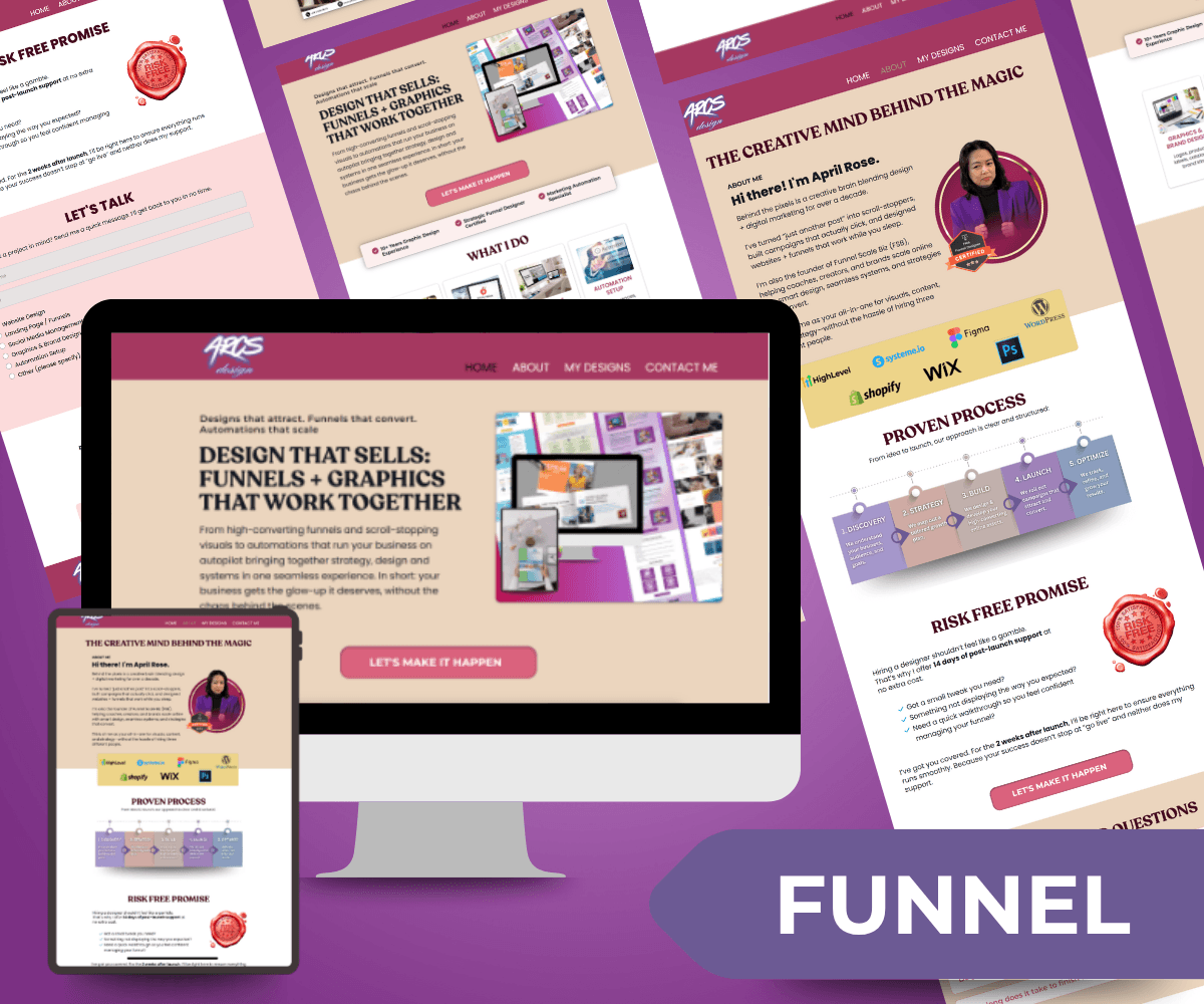 I am a graphic designer, strategic funnel designer, growth-minded creative with a passion for turning ideas into impactful digital experiences and the founder / owner of Funnel Scale Biz (a DTI-registered company). Through Funnel Scale Biz, I help coaches, course creators, E-com brands, and wellness providers create online systems that look stunning, work seamlessly, and bring measurable results.